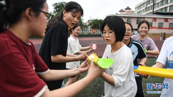 6月1日,在廣西河池市都安瑤族自治縣高級中學(xué)操場上,高三年級女生在玩乒乓球接龍游戲。