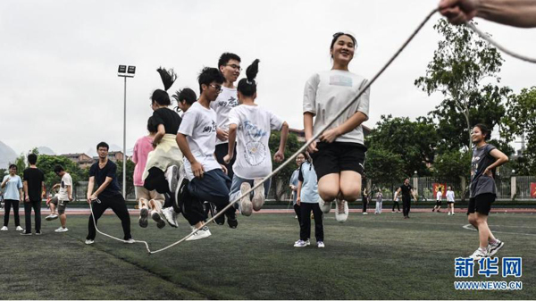 6月1日,在廣西河池市都安瑤族自治縣高級中學(xué)操場上,高三年級學(xué)生在開展跳繩比賽。