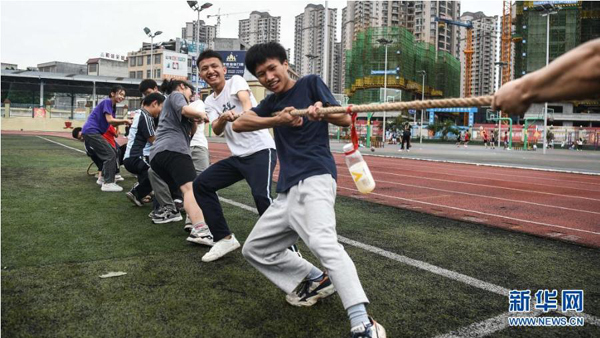 6月1日,在廣西河池市都安瑤族自治縣高級中學(xué)操場上,高三年級學(xué)生在開展拔河比賽。
