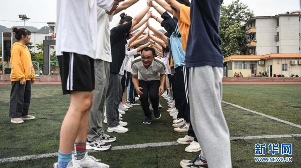 6月1日,在廣西河池市都安瑤族自治縣高級中學(xué)操場上,高三年級一位班主任帶領(lǐng)學(xué)生開展游戲活動。