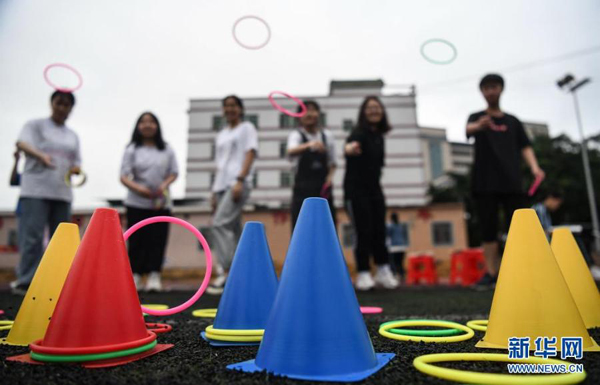 6月1日,廣西河池市都安瑤族自治縣高級中學(xué)高三學(xué)生在操場上玩套圈圈游戲。