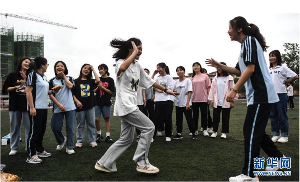 6月1日,在廣西河池市都安瑤族自治縣高級中學(xué)操場上,高三年級女生在玩游戲。