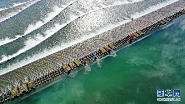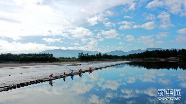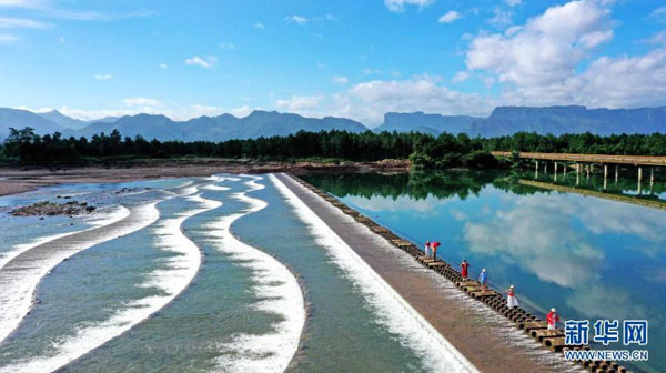 當(dāng)日,浙江省臺州市仙居縣永安溪流域水面如鏡,藍(lán)天、白云倒影水中,構(gòu)成一幅美麗的畫卷。新華社發(fā)(王華斌 攝)