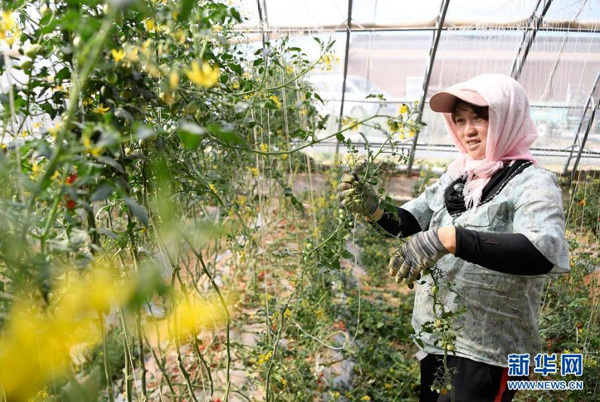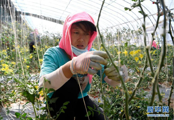 農(nóng)戶在寧夏石嘴山市平羅縣陶樂鎮(zhèn)廟廟湖沙漠瓜菜園區(qū)蔬菜大棚打理番茄藤(7月7日攝)。