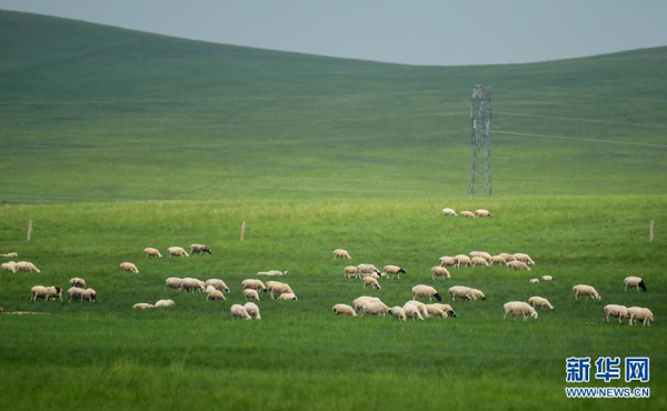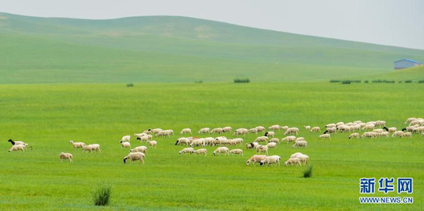 7月12日,羊群在錫林郭勒大草原上覓食。