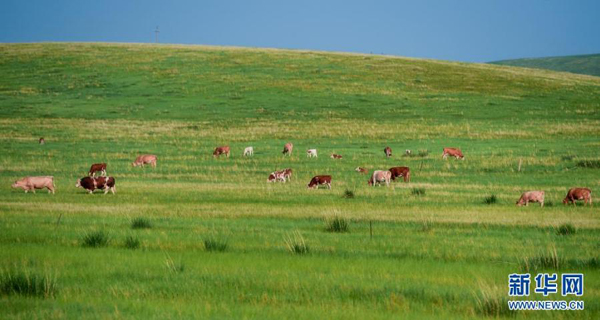 7月11日,牛群在錫林郭勒大草原上覓食。