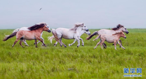 7月12日,馬群在錫林郭勒大草原上奔跑。