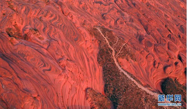 8月6日,朝霞映照下的靖邊縣龍洲鎮(zhèn)波浪谷丹霞景區(qū)(無人機照片)。