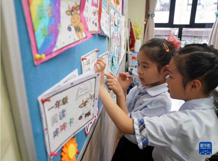 9月1日,上海市黃浦區(qū)盧灣二中心小學(xué)的教室內(nèi),學(xué)生們?cè)诜赐瑢W(xué)暑假里的閱讀書(shū)目和筆記。