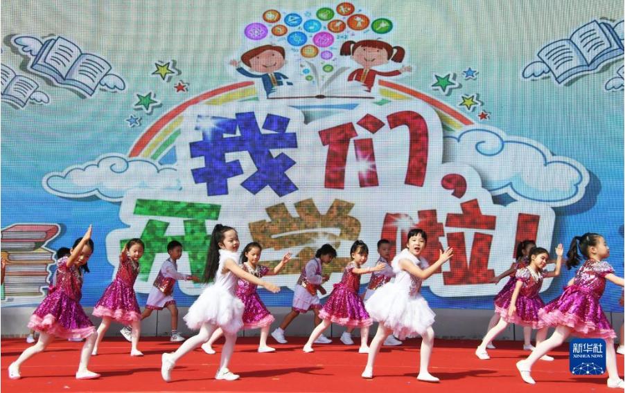9月1日,在北京市海淀區(qū)太平路小學(xué),學(xué)生在開(kāi)學(xué)典禮中表演節(jié)目。