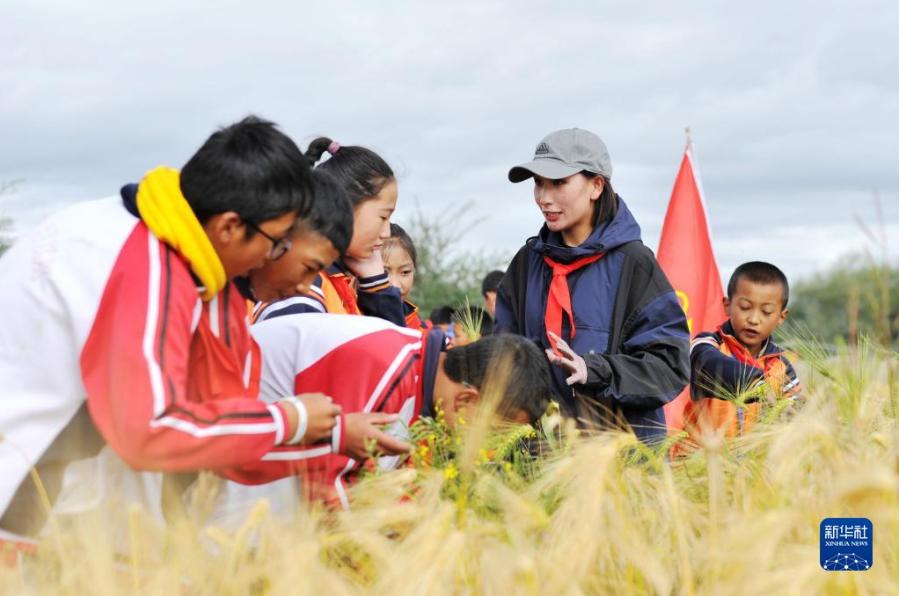 日喀則市上海實驗學校的學生們在青稞地里聽講解(9月17日攝)。