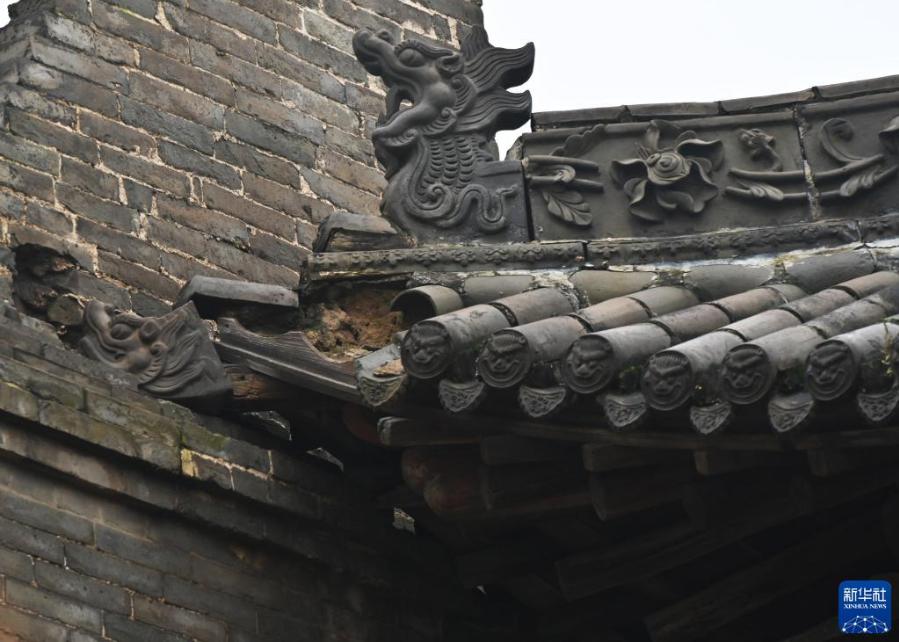 全國重點(diǎn)文物保護(hù)單位山西省汾城古建筑群的城隍廟一處建筑檐部瓦件脫落(10月12日攝)。