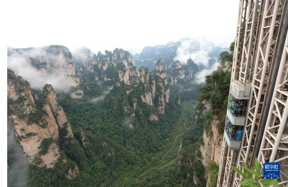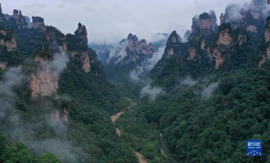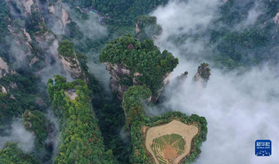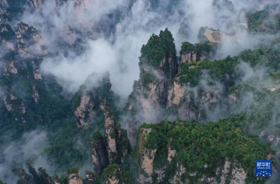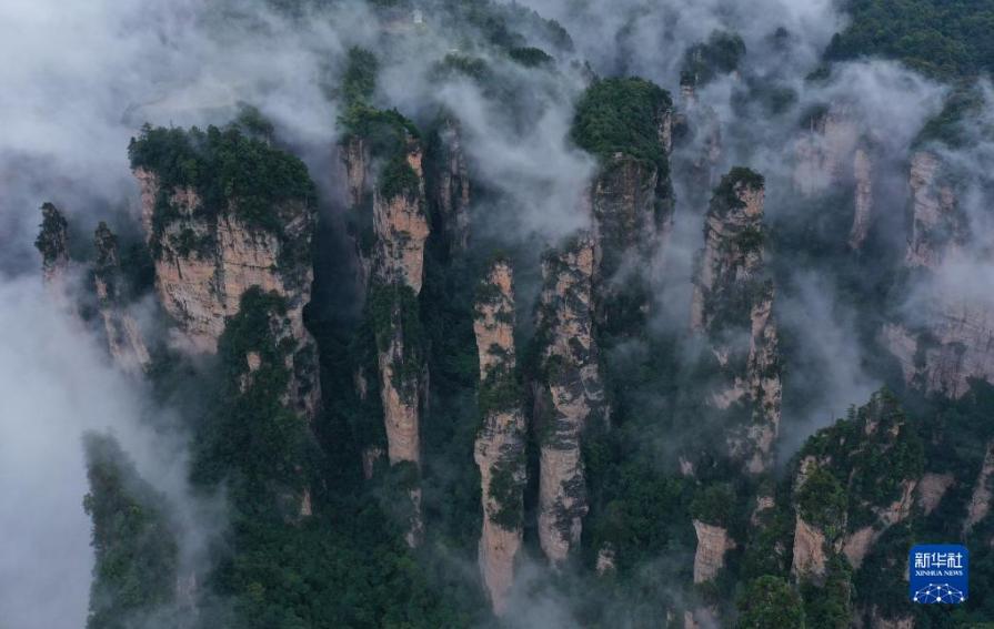 當(dāng)日,雨后的湖南張家界武陵源,云霧飄蕩在峰林之間,若隱若現(xiàn),美不勝收(無人機(jī)照片)。新華社發(fā)(吳勇兵 攝)