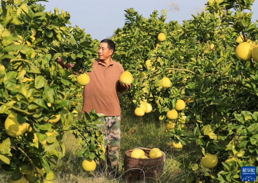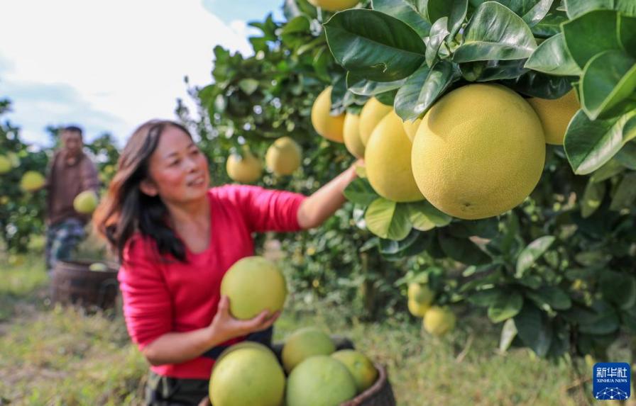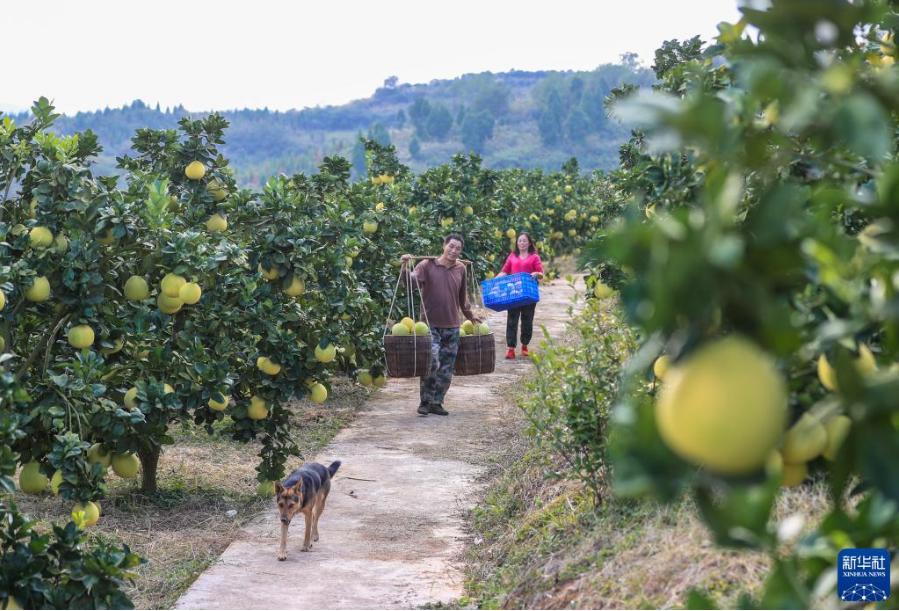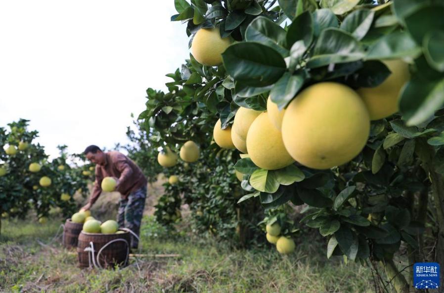 金秋時節(jié),貴州省銅仁市玉屏侗族自治縣種植的柚子迎來豐收,當(dāng)?shù)卮迕褡ゾo采摘、分揀、挑運柚子,供應(yīng)市場。近年來,玉屏侗族自治縣依托當(dāng)?shù)厣鷳B(tài)資源優(yōu)勢,采取“公司+合作社+農(nóng)戶”模式,引導(dǎo)農(nóng)民種植柚子,帶動農(nóng)民增收。