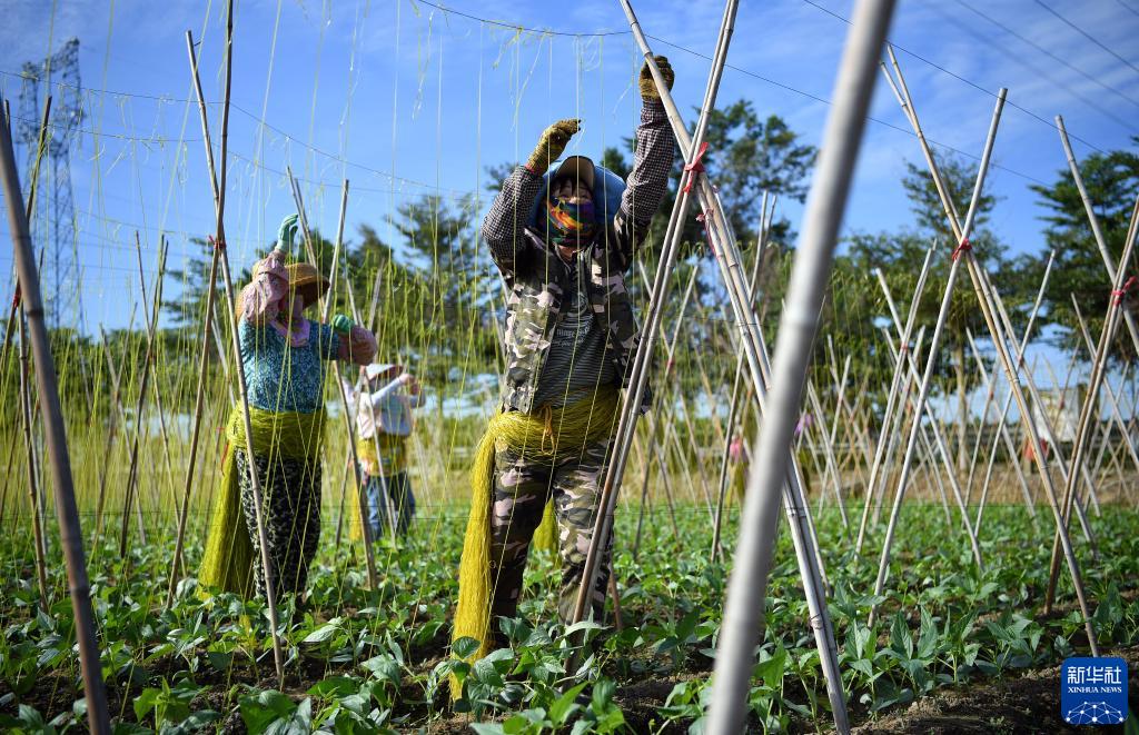 11月16日,三亞市崖州區(qū)的農(nóng)民在田間給豇豆搭架。新華社記者 郭程 攝