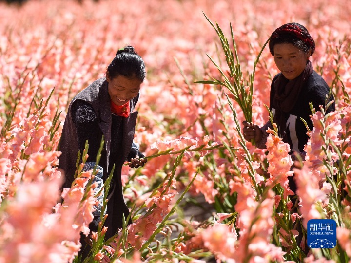 西藏拉薩市四季吉祥村村民在采摘雪菊(2017年9月27日攝)。