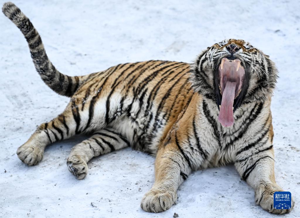1月13日,在吉林省東北虎園內(nèi),一只東北虎在雪地上打哈欠。