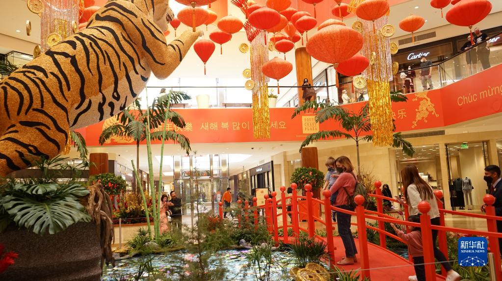 1月27日,人們在美國奧蘭治縣的南海岸廣場觀看虎年裝飾。