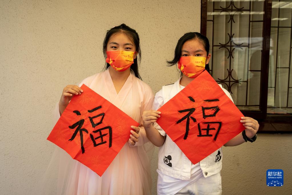 1月28日,在南非開普敦,華僑華人子女展示“福”字。