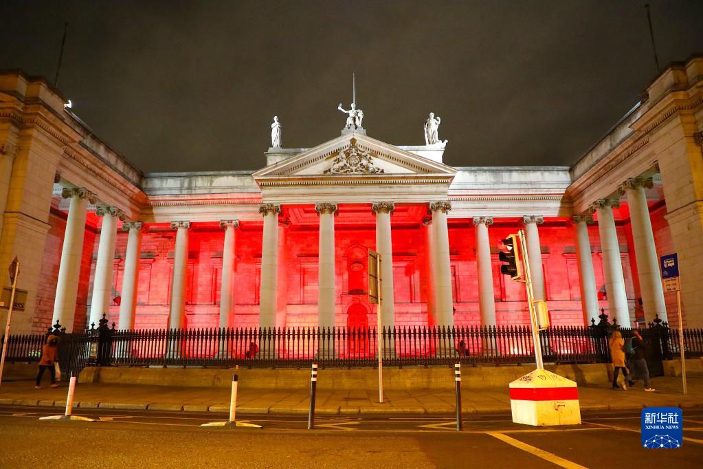 這是1月28日在愛爾蘭都柏林拍攝的點(diǎn)亮“中國紅”的一棟建筑。從1月28日至2月1日,都柏林各主要標(biāo)志性建筑將點(diǎn)亮“中國紅”,慶祝中國農(nóng)歷新年。