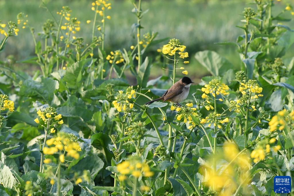 2月4日,在貴州省遵義市余慶縣,小鳥在油菜花田中小憩。