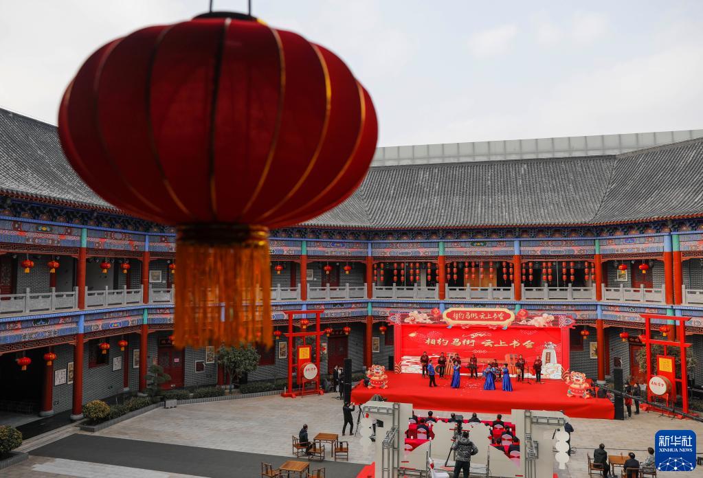 2月13日,藝人在河南省寶豐縣馬街書(shū)會(huì)景區(qū)進(jìn)行線上直播表演。