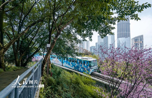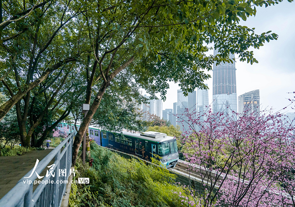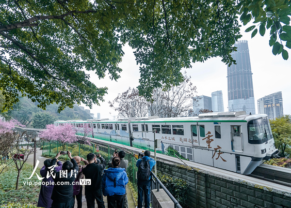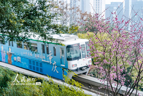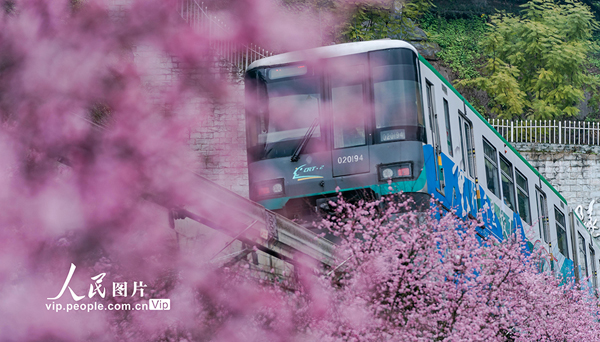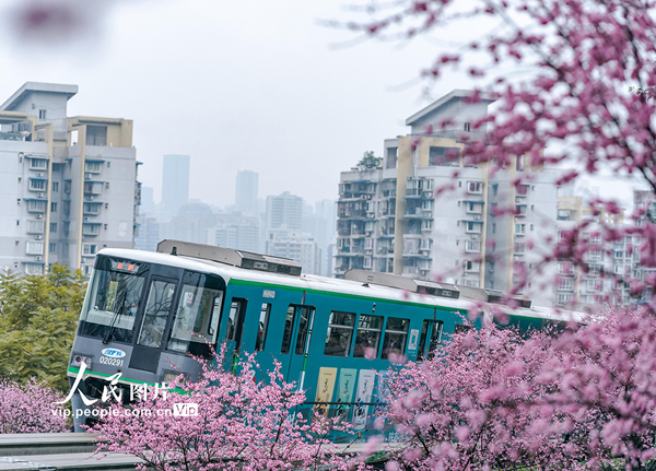 2022年2月20日,重慶市軌道交通二號線佛圖關(guān)段的美人梅迎春綻放,列車穿行花海,猶如開往春天的列車。李洪波攝(人民圖片網(wǎng))