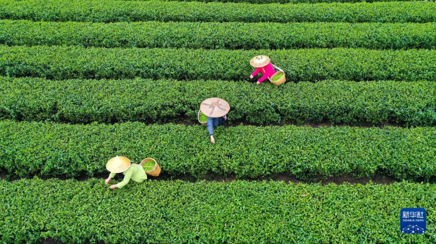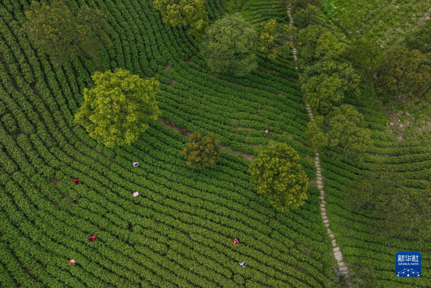 3月27日,茶農(nóng)在浙江省湖州市長興縣和平鎮(zhèn)灘龍橋村的高山茶園采摘茶鮮葉(無人機照片)。