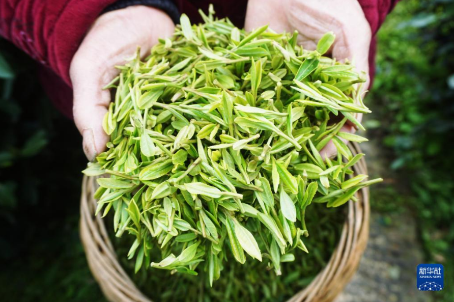 3月27日,在杭州西湖區(qū)的西湖龍井一級保護區(qū)的茶園里拍攝到的剛采摘的西湖龍井明前茶嫩芽。