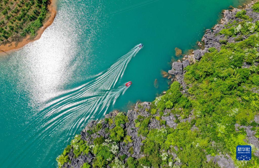 4月21日,在湖南省永州市道縣壽雁鎮(zhèn)樂海水庫(kù),護(hù)水志愿者乘坐快艇進(jìn)行水上巡查作業(yè)(無人機(jī)照片)。