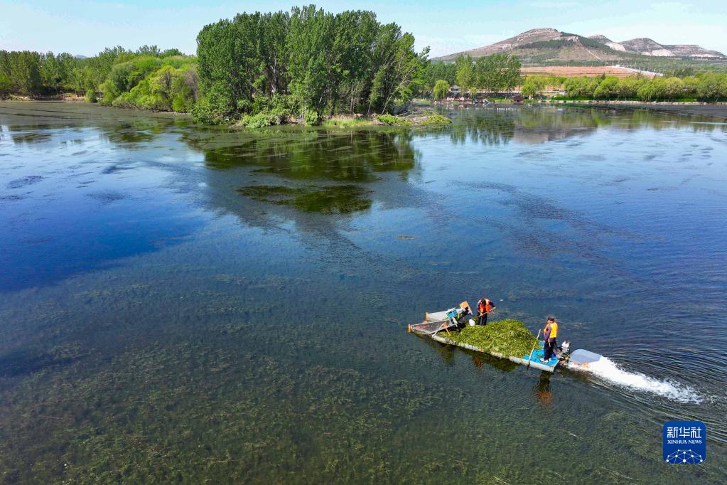 4月21日,在山東省青州市堯王湖,工作人員清理水草和垃圾(無人機(jī)照片)。