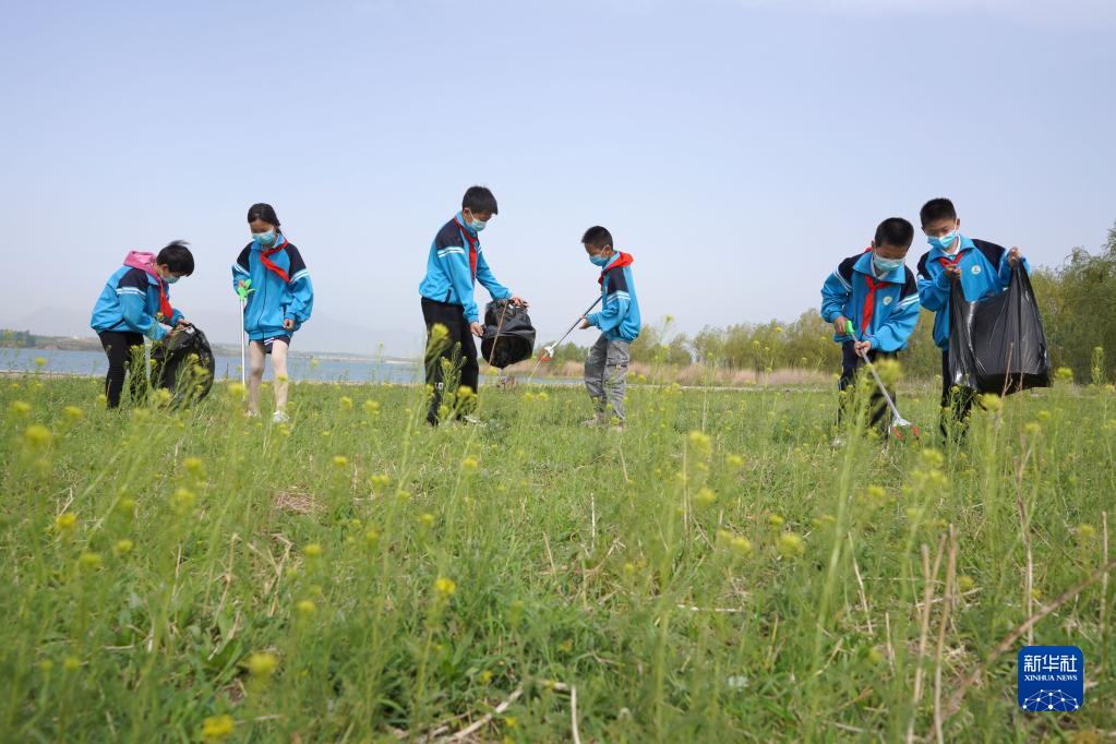 4月21日,河北省邢臺(tái)市內(nèi)丘縣柳林鎮(zhèn)中心小學(xué)學(xué)生在鵲山湖畔撿拾垃圾。
