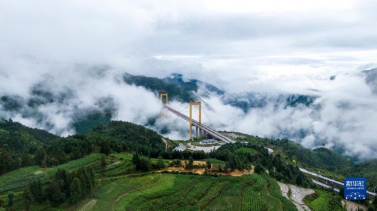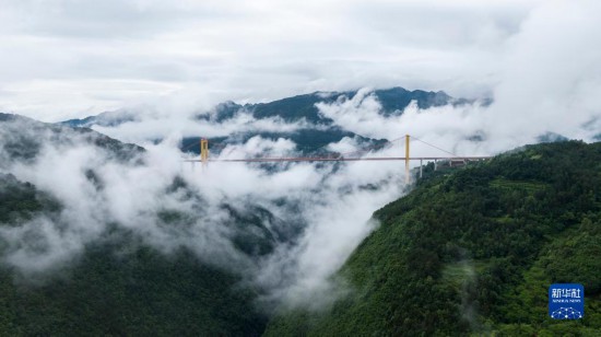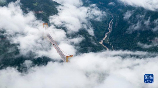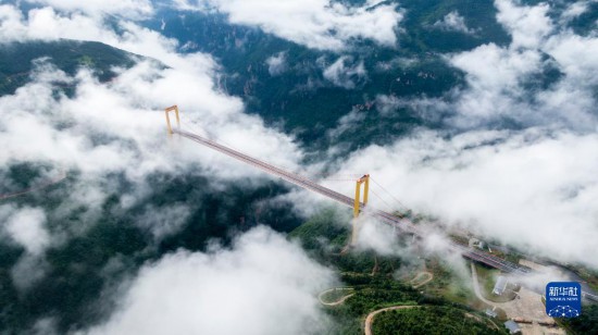 普立大橋位于云南省曲靖市宣威市,橫跨寶山、普立兩個鄉(xiāng)鎮(zhèn),是一座高速公路鋼箱梁懸索橋,全長1040米,橋面距離谷底達500米。大橋所在地山勢陡峭,六月當?shù)赜昙旧介g云霧繚繞,黃色的大橋在云海之中若隱若現(xiàn),宛如建設(shè)在云層之上。