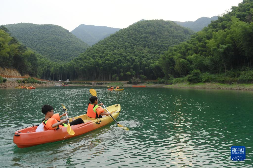 8月1日,小學(xué)生在位于紹興市富盛鎮(zhèn)的水上運(yùn)動(dòng)基地參加皮劃艇拓展活動(dòng)。