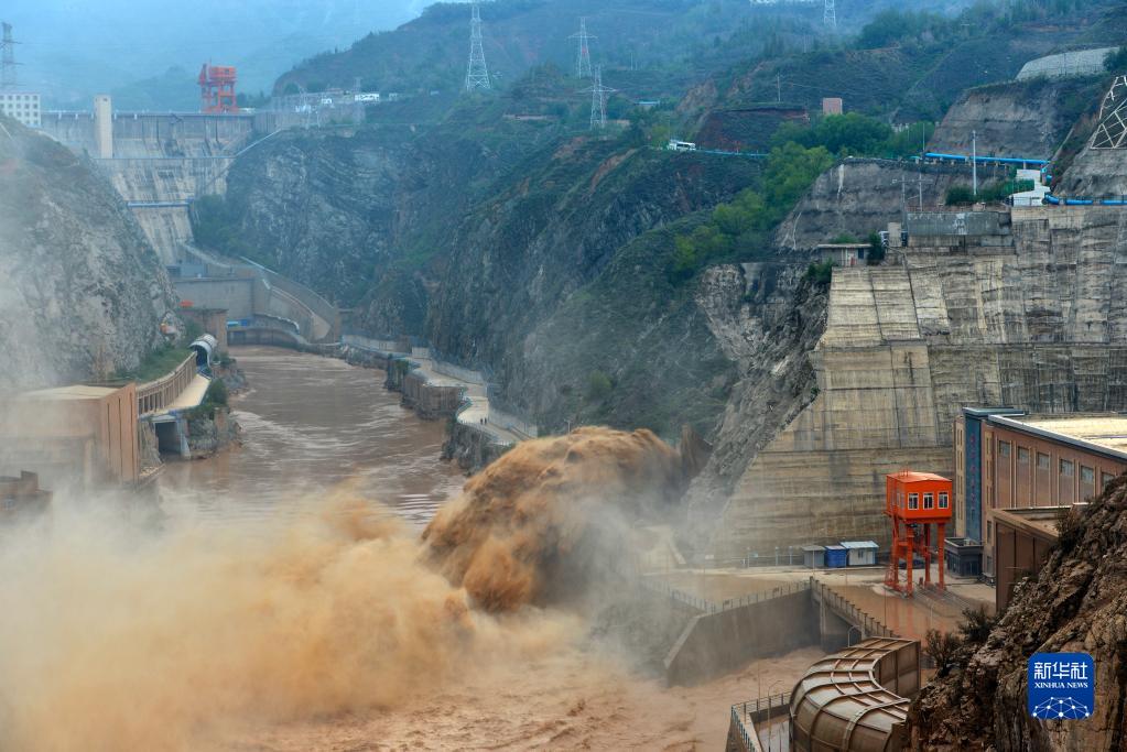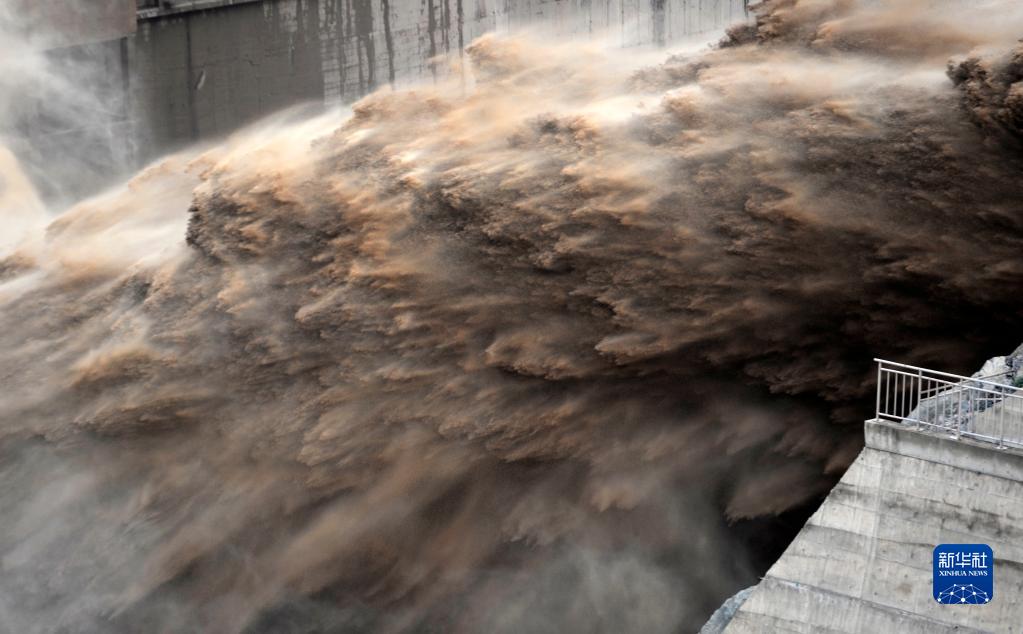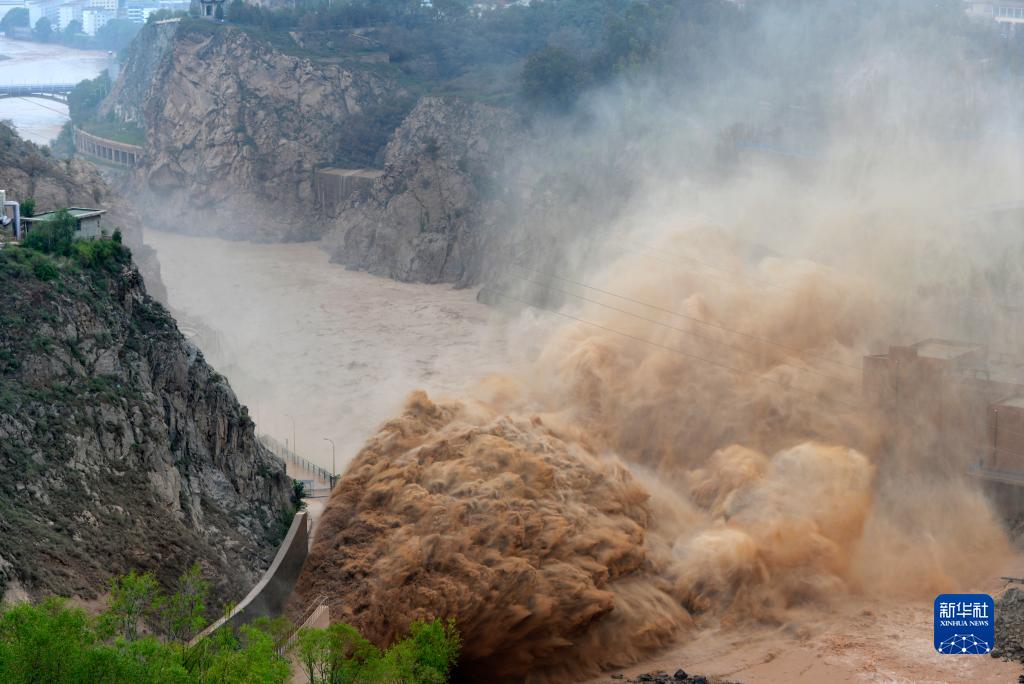 當日,受強降水天氣影響,黃河劉家峽水庫來沙量急劇增加,劉家峽水庫按照調度要求進行調水排沙。夾裹著大量泥沙的水流從排沙洞出口噴涌而出,場面壯觀。