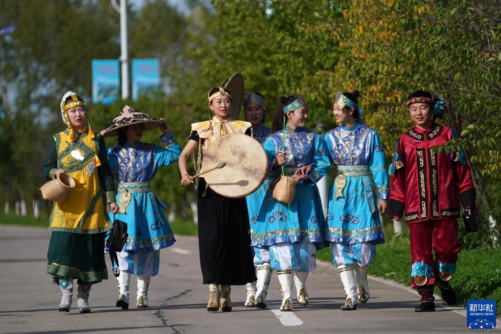 9月4日,在撫遠(yuǎn)市烏蘇鎮(zhèn)抓吉赫哲族村,身著民族服裝的工作人員前往赫哲民俗展示館。
