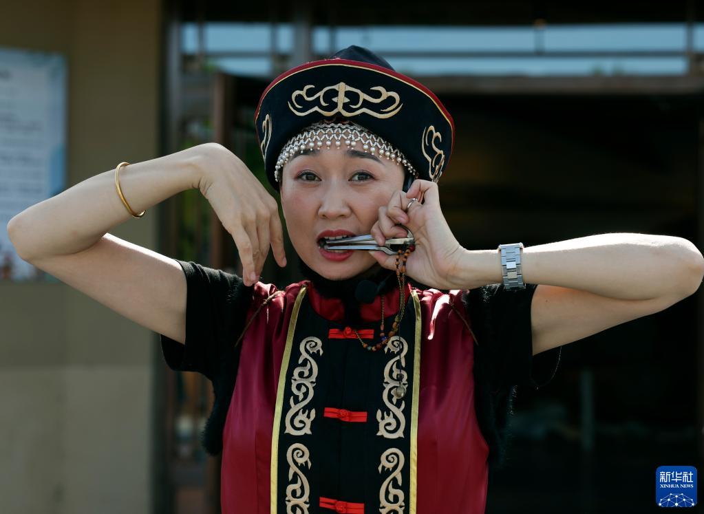 9月4日,在撫遠(yuǎn)市烏蘇鎮(zhèn)抓吉赫哲族村赫哲民俗展示館,工作人員在表演口弦琴。