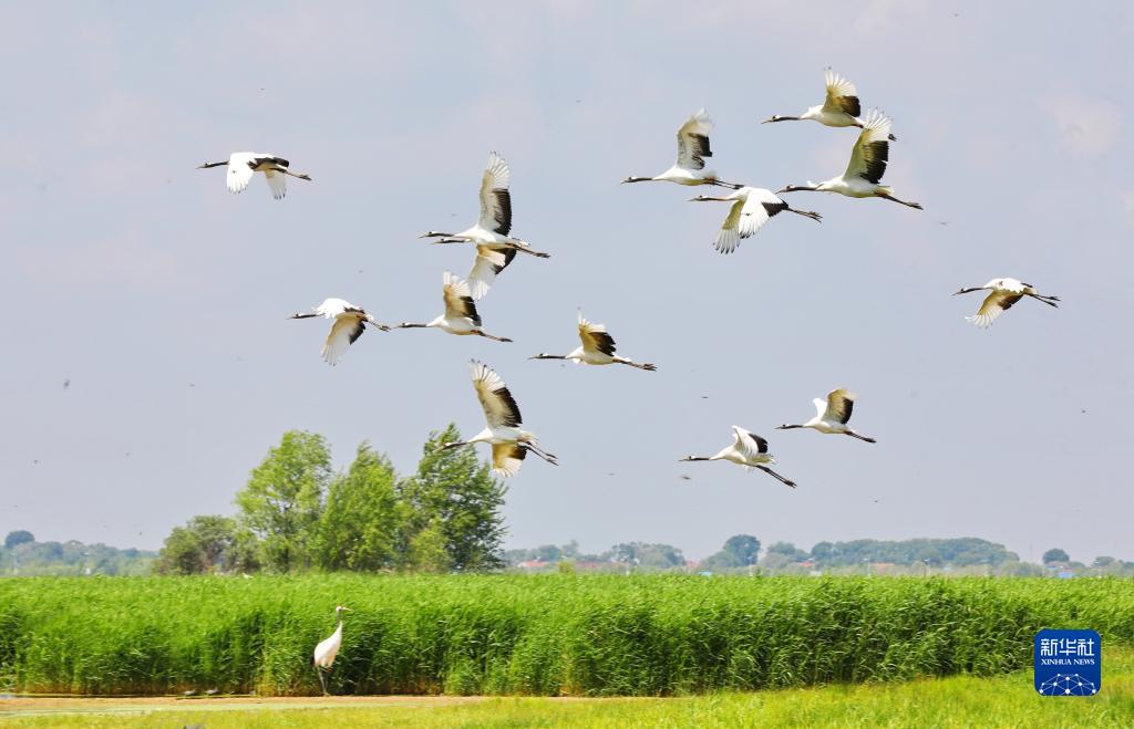 丹頂鶴在黑龍江扎龍國家級自然保護區(qū)自由翱翔(2022年6月15日攝)。 新華社發(fā)(宋燕軍 攝)
