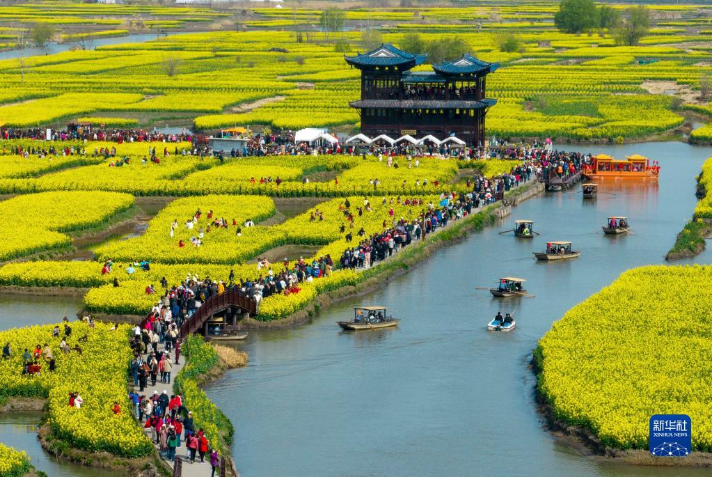 3月19日,游客在江蘇興化千垛菜花風景區(qū)游覽(無人機照片)。