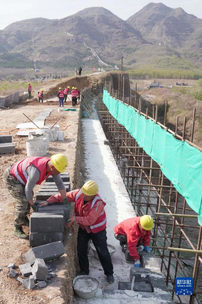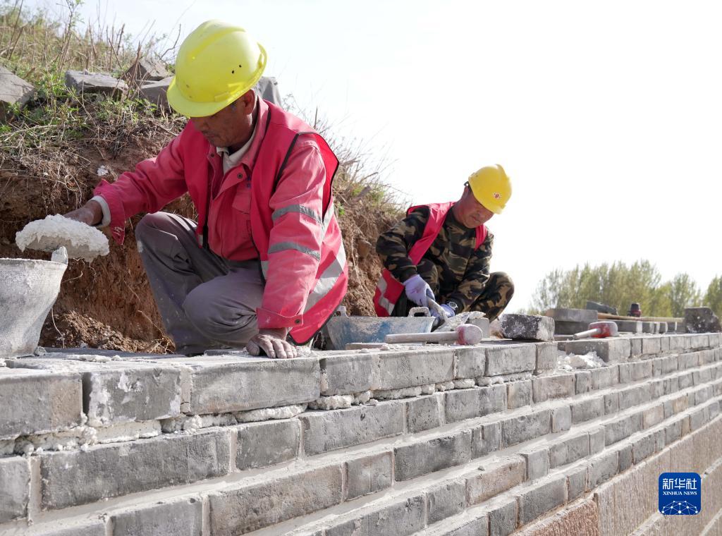 4月19日,工人在山海關(guān)長城北翼城修繕工程工地施工。
