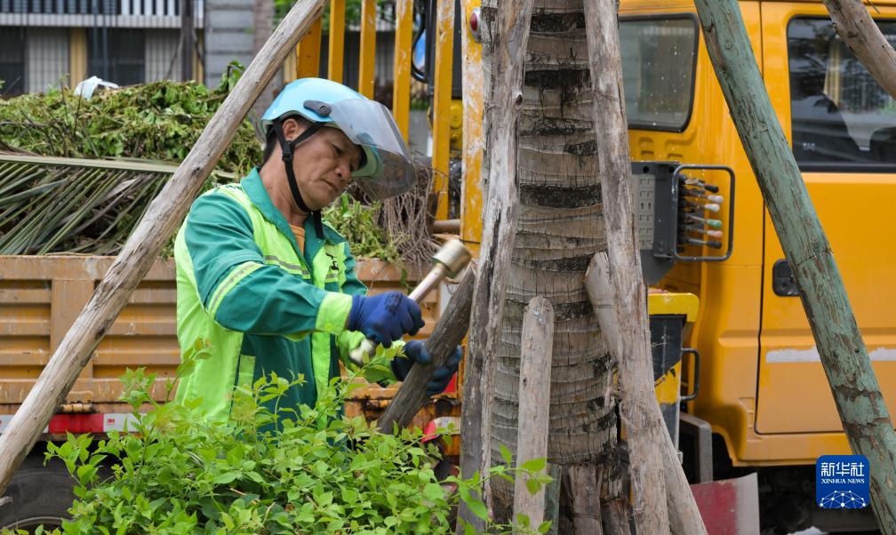 7月17日,在海口市新海大道,工作人員對樹木進(jìn)行加固。