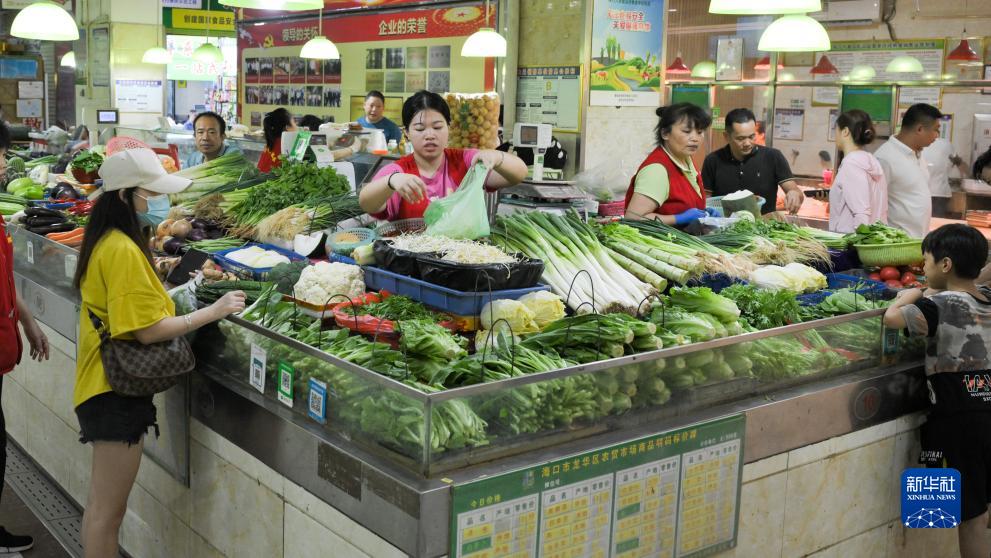 7月17日,在海口市金貿(mào)文華農(nóng)貿(mào)市場,市民有序選購蔬菜。