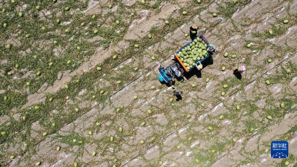 農(nóng)戶在中衛(wèi)市沙坡頭區(qū)香山鄉(xiāng)收獲硒砂瓜(無(wú)人機(jī)照片,7月21日攝)。