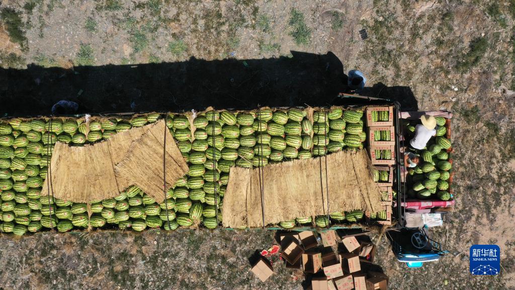 農(nóng)戶在中衛(wèi)市沙坡頭區(qū)香山鄉(xiāng)將硒砂瓜裝車運(yùn)往湖北(無(wú)人機(jī)照片,7月21日攝)。