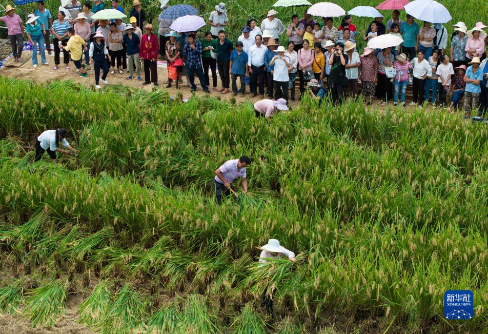 9月2日,在鹽邊縣惠民鎮(zhèn)興隆村的稻田里,來自惠民鎮(zhèn)的村民在進行稻谷收割比賽(無人機照片)。