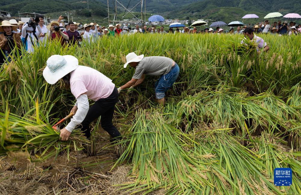 9月2日,在鹽邊縣惠民鎮(zhèn)興隆村的稻田里,來自惠民鎮(zhèn)的村民在參與稻谷收割比賽。