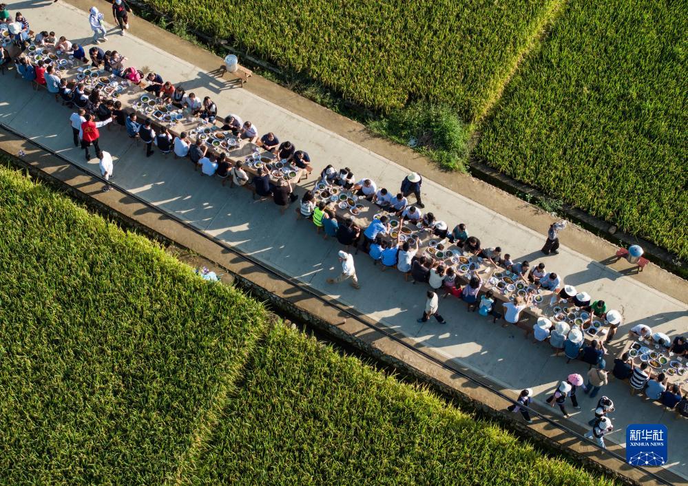 9月2日,在鹽邊縣惠民鎮(zhèn)興隆村的稻田邊,人們在豐收長桌宴上享用當(dāng)?shù)貍鹘y(tǒng)美食(無人機照片)。