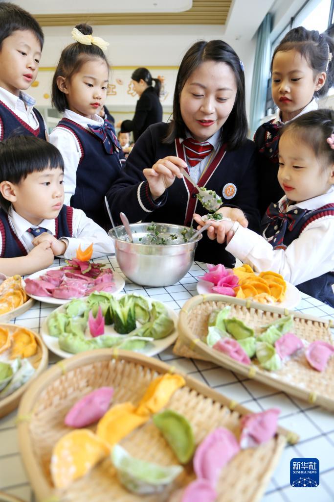 11月8日,在江蘇省連云港市蘇外(連云港)幼兒園,老師教小朋友包餃子。