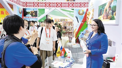 在白俄羅斯展區(qū),參展商向客商介紹產(chǎn)品。