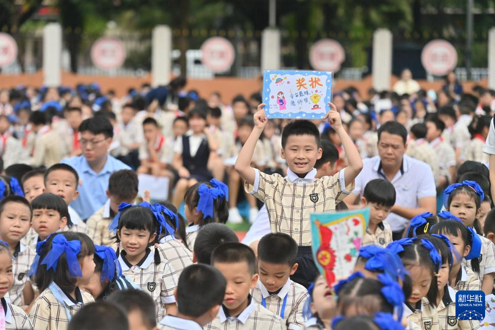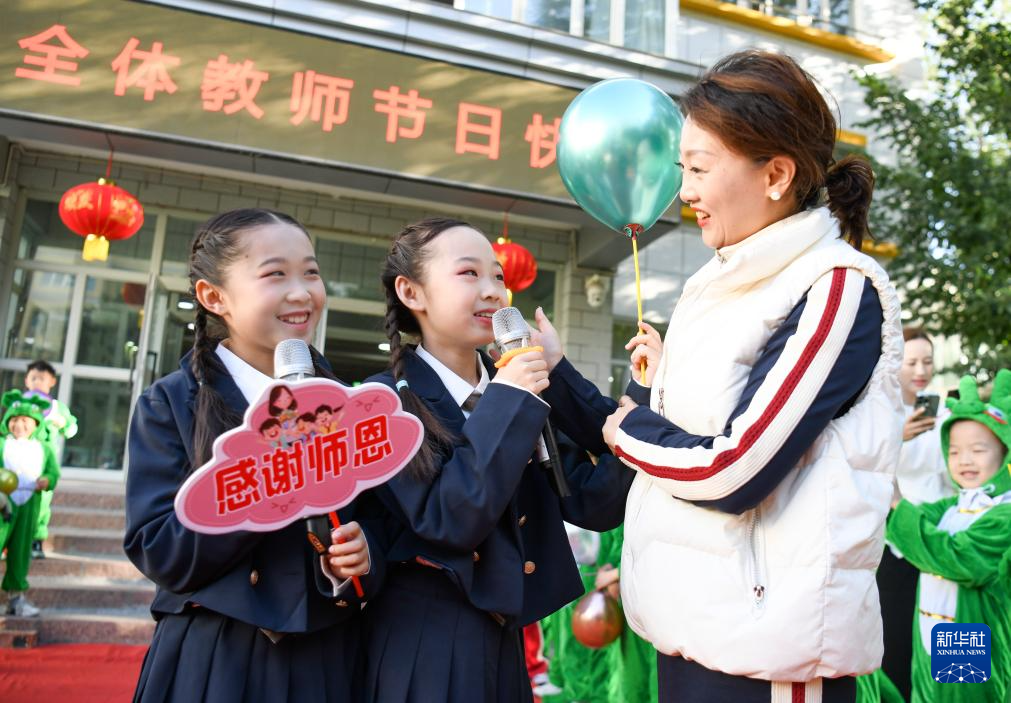 9月10日,在新疆教育學院實驗小學校園,學生為老師獻歌送上祝福。